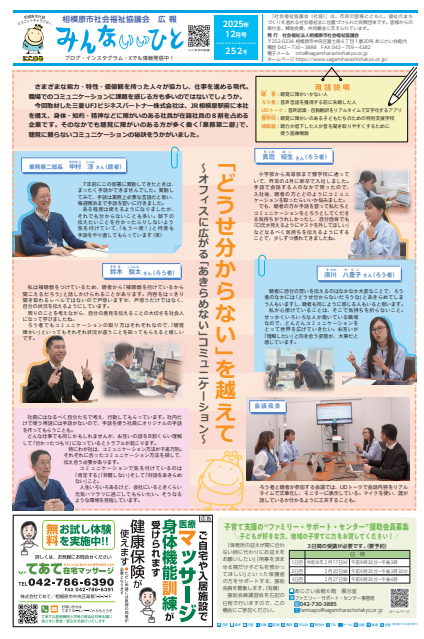 2025年12月に当社の社員が、相模原市社会福祉協議会の広報誌に掲載されました。インタビューでは、聴覚に障がいのある社員とその上司が、会社での生活やコミュニケーションの工夫について語りました。