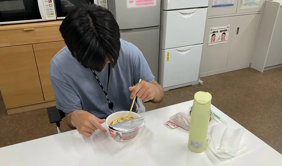 私は基本的にお弁当を持参していますが、本日はカップラーメンとおにぎりでした。お弁当を持ってきていないときは、近くにあるコンビニやお弁当屋さんで買うこともあります。